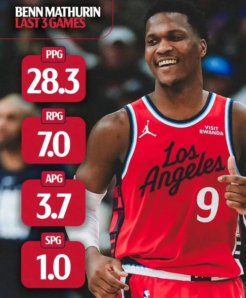 马瑟林刚来到快船,哈登也走了,加兰还么付出,球队攻击点就剩小卡一个,他虽然打替补,但泰伦卢真让他放开了抡。好家伙,他直接把快船新球馆点燃了。前五战场均22分6.2篮板3.6助攻1.8抢断,其中三场更是飙到场均28.3分。