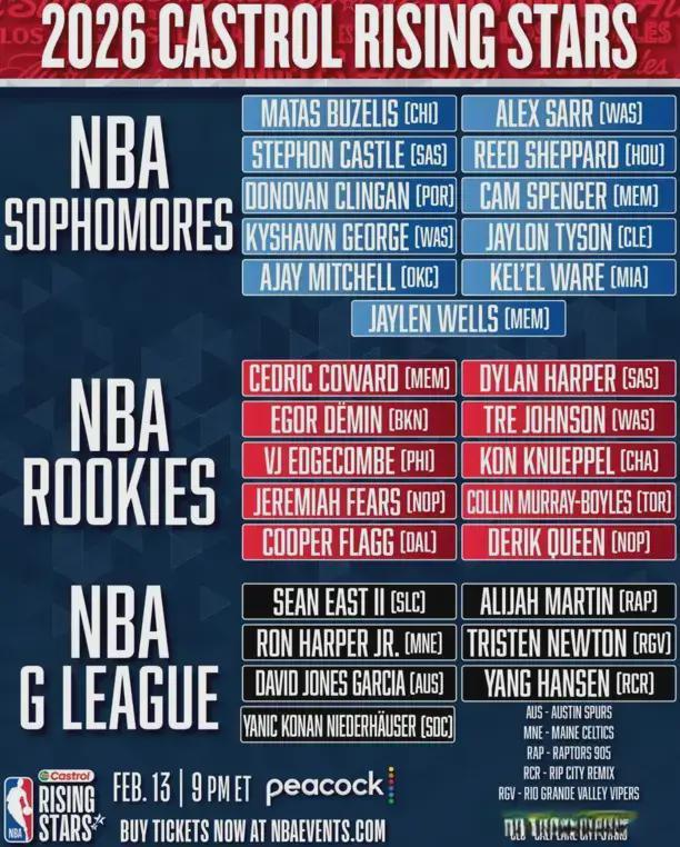 如果你刷到了今日NBA官方公布的2026年全明星新秀赛完整名单,那必然不会毫无情绪波动。